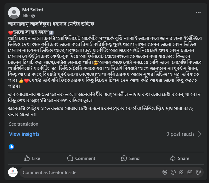 আমি কাজ করছি Faceless Content Creation নিয়ে—AI Tools ব্যবহার করে কিভাবে কনটেন্ট বানানো যায় এবং বিশেষ করে ইউরোপ-আমেরিকা মার্কেট টার্গেট করে কনটেন্ট তৈরি করা যায়, সেটাই আমার মূল ফোকাস। আমার যাত্রা শুরু ২০১৭ সালে। ধীরে ধীরে কনটেন্ট ক্রিয়েশনকে ফুল-টাইম ক্যারিয়ার হিসেবে নিয়ে আজও কাজ করে যাচ্ছি। এই সময়ের মধ্যে আমি অসংখ্য প্রজেক্টে কাজ করেছি, যার মাধ্যমে প্রচুর বাস্তব অভিজ্ঞতা অর্জন করেছি। সেই অভিজ্ঞতাগুলোই আমি এই কোর্সে আপনাদের সাথে শেয়ার করবো। এর পাশাপাশি আমি প্রতিষ্ঠা করেছি ScaleX, একটি সফটওয়্যার কোম্পানি। সফটওয়্যার ও ডিজিটাল সলিউশনের পাশাপাশি, ২০২১ সালে আমরা শুরু করি Creator Inside, যার মাধ্যমে ইতোমধ্যেই ৫,০০০+ শিক্ষার্থীকে কনটেন্ট ক্রিয়েশন শেখানো হয়েছে। এই কোর্সে আমি শুধু শেখাবো না, বরং শেয়ার করবো আমার ব্যবহার করা Secrets, Tips & Tricks এবং অসংখ্য ভ্যালুয়েবল রিসোর্স, যা আমাকে এই জার্নিতে এগিয়ে নিয়েছে।